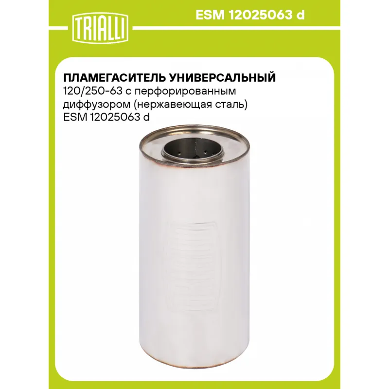 Пламегаситель универсальный 120/250-63 с перфорированным диффузором (нержавеющая сталь) Характеристики: Артикул: ESM 12025063 d OEM номера: 12025063 d Материал: Нержавеющая сталь AISI 430 Особенности конструкции:: Труба перфорированная с диффузором, шерсть нержавеющая, набивка жаро-шумопоглощающая Длина, мм: 250 Диаметр корпуса,... Читать полностью →