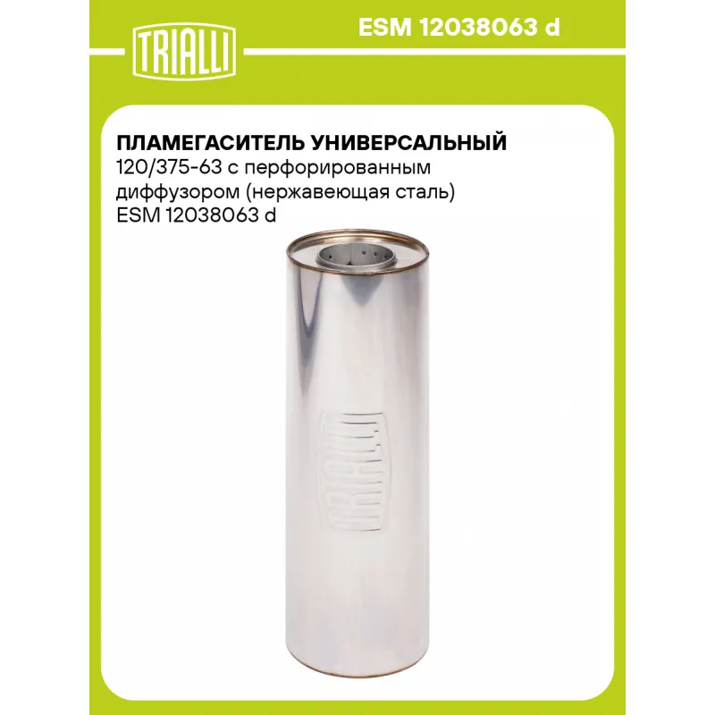 Пламегаситель универсальный 120/375-63 с перфорированным диффузором (нержавеющая сталь) Характеристики: Артикул: ESM 12038063 d OEM номера: 12038063 d Материал: Нержавеющая сталь AISI 430 Особенности конструкции:: Труба перфорированная с диффузором, шерсть нержавеющая, набивка жаро-шумопоглощающая Длина, мм: 375 Диаметр корпуса,... Читать полностью →