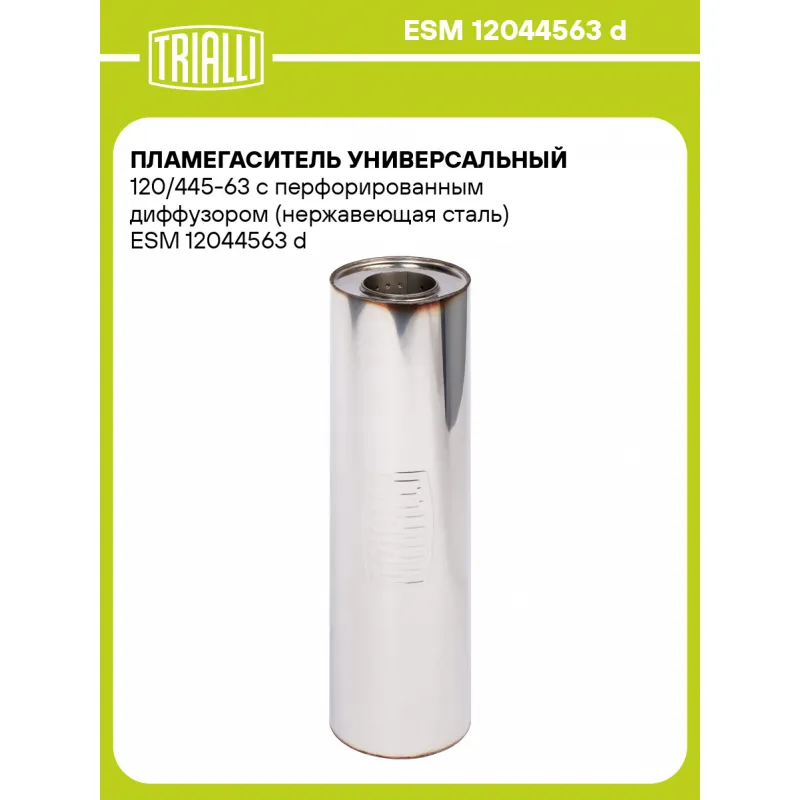 Пламегаситель универсальный 120/445-63 с перфорированным диффузором (нержавеющая сталь) Характеристики: Артикул: ESM 12044563 d OEM номера: 12044563 d Материал: Нержавеющая сталь AISI 430 Особенности конструкции:: Труба перфорированная с диффузором, шерсть нержавеющая, набивка жаро-шумопоглощающая Длина, мм: 445 Диаметр корпуса,... Читать полностью →