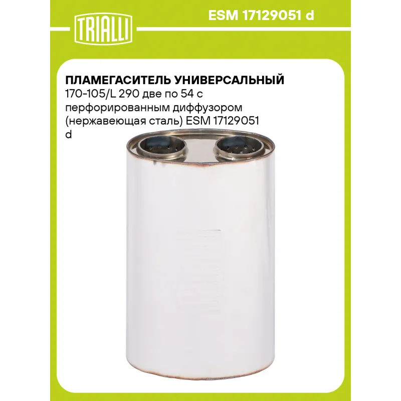 Пламегаситель универсальный 170-105/L 290 две по 54 с перфорированным диффузором (нержавеющая сталь) Характеристики: Артикул: ESM 17129051 d OEM номера: 17129051 d Материал: Нержавеющая сталь AISI 430 Особенности конструкции:: Труба перфорированная с диффузором, шерсть нержавеющая, набивка жаро-шумопоглощающая Длина, мм: 290 Гарантийный срок: 2 года/60 тыс. Диаметр корпуса D-1 (мм): 170 Диаметр корпуса D-2 (мм): 105 Диаметр перфор. трубы (мм): две по 54 Количество на автомобиль: 1 Товарная линейка: BLACK Комплектация: Пламегаситель с перфорированным диффузором - 1 шт Гарантия: от 1 года.