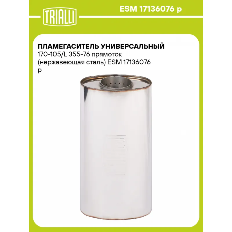 Пламегаситель универсальный 170-105/L 355-76 прямоток (нержавеющая сталь) Характеристики: Артикул: ESM 17136076 p OEM номера: 17136076 p Материал: Нержавеющая сталь AISI 430 Особенности конструкции:: Труба перфорированная, шерсть нержавеющая, набивка жаро-шумопоглощающая Длина, мм: 355 Гарантийный срок: 2 года/60 тыс. Диаметр ко... Читать полностью →