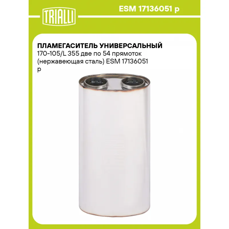 Пламегаситель универсальный 170-105/L 355 две по 54 прямоток (нержавеющая сталь) Характеристики: Артикул: ESM 17136051 p OEM номера: 17136051 p Материал: Нержавеющая сталь AISI 430 Особенности конструкции:: Труба перфорированная, шерсть нержавеющая, набивка жаро-шумопоглощающая Длина, мм: 355 Гарантийный срок: 2 года/60 тыс. Диаметр корпуса D-1 (мм): 170 Диаметр корпуса D-2 (мм): 105 Диаметр перфор. трубы (мм): две по 54 Количество на автомобиль: 1 Товарная линейка: BLACK Комплектация: Пламегаситель магистральный прямоточный - 1 шт Гарантия: от 1 года.