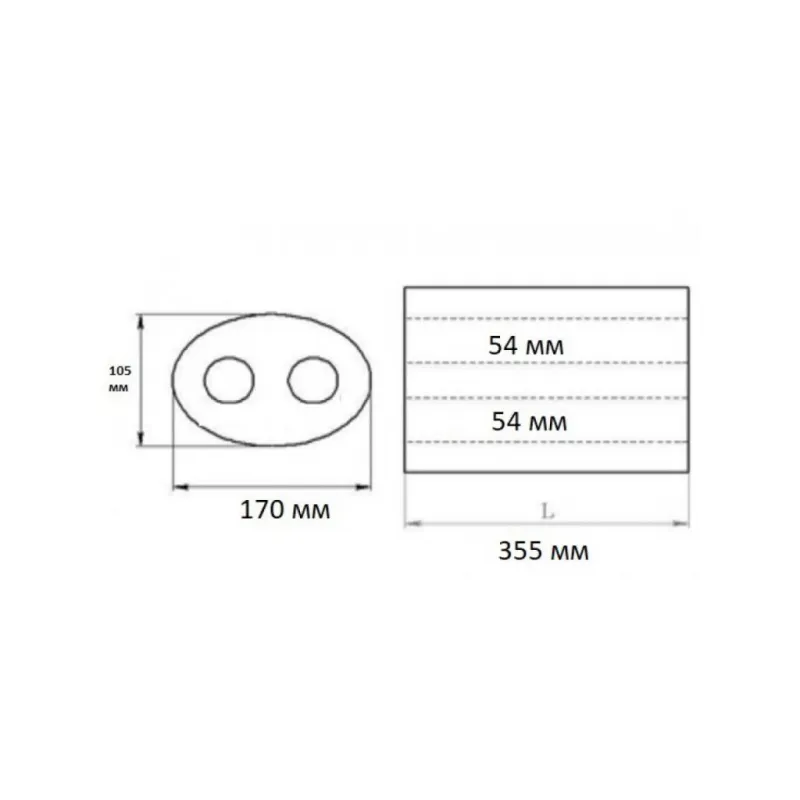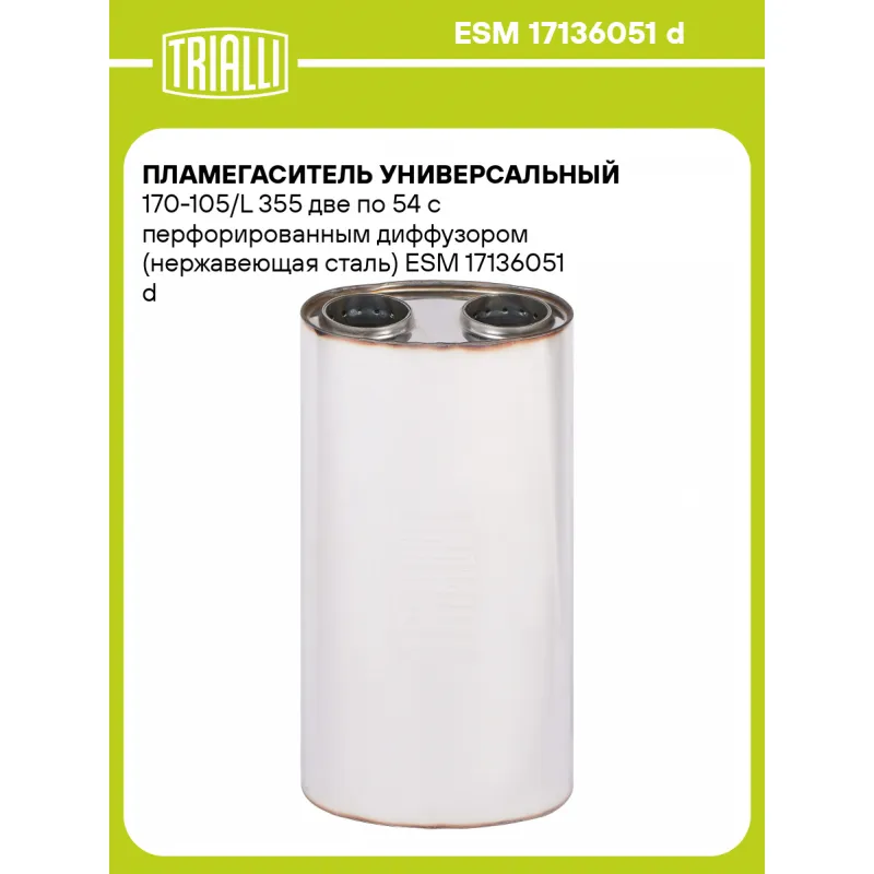 Пламегаситель универсальный 170-105/L 355 две по 54 с перфорированным диффузором (нержавеющая сталь) Характеристики: Артикул: ESM 17136051 d OEM номера: 17136051 d Материал: Нержавеющая сталь AISI 430 Особенности конструкции:: Труба перфорированная с диффузором, шерсть нержавеющая, набивка жаро-шумопоглощающая Длина, мм: 355 Гарантийный срок: 2 года/60 тыс. Диаметр корпуса D-1 (мм): 170 Диаметр корпуса D-2 (мм): 105 Диаметр перфор. трубы (мм): две по 54 Количество на автомобиль: 1 Товарная линейка: BLACK Комплектация: Пламегаситель с перфорированным диффузором - 1 шт Гарантия: от 1 года.
