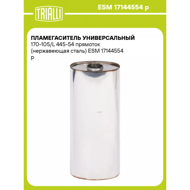 Пламегаситель универсальный 170-105/L 445-54 прямоток (нержавеющая сталь) Характеристики: Артикул: ESM 17144554 p OEM номера: 17144554 p Материал: Нержавеющая сталь AISI 430 Особенности конструкции:: Труба перфорированная, шерсть нержавеющая, набивка жаро-шумопоглощающая Длина, мм: 445 Гарантийный срок: 2 года/60 тыс. Диаметр ко... Читать полностью →