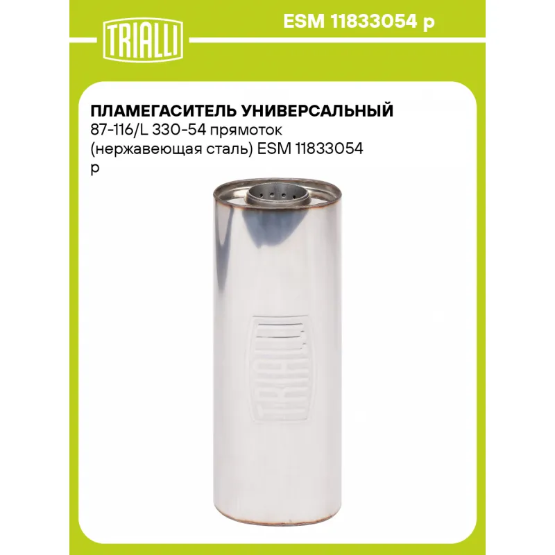 Пламегаситель универсальный 87-116/L 330-54 прямоток (нержавеющая сталь) Характеристики: Артикул: ESM 11833054 p OEM номера: 11833054 p Материал: Нержавеющая сталь AISI 430 Особенности конструкции:: Труба перфорированная, шерсть нержавеющая, набивка жаро-шумопоглощающая Длина, мм: 330 Гарантийный срок: 2 года/60 тыс. Диаметр кор... Читать полностью →