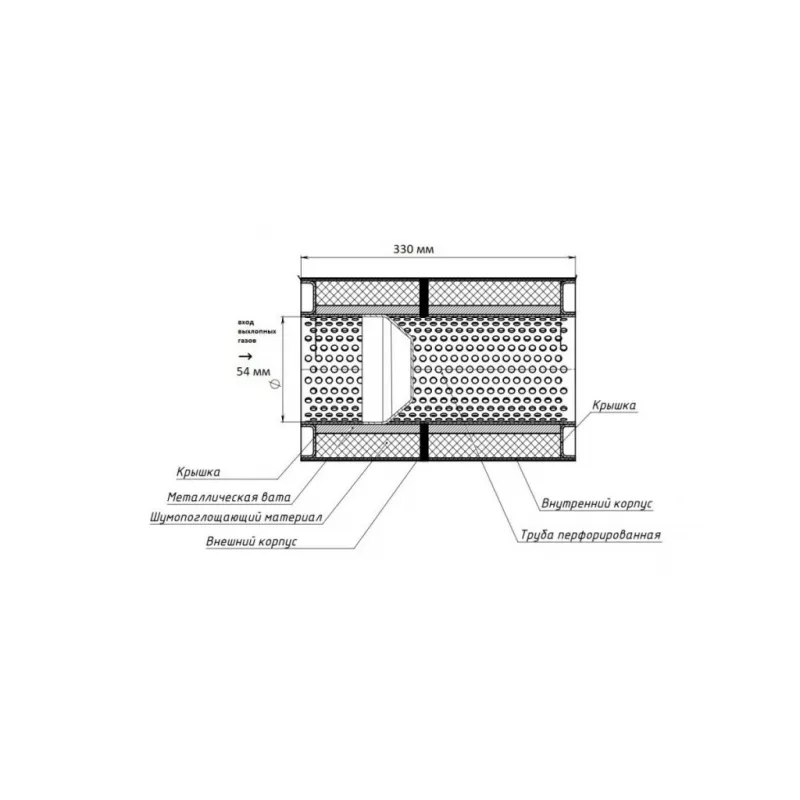 Особенности конструкции: Труба перфорированная с диффузором, шерсть нержавеющая, набивка жаро-шумопоглощающая