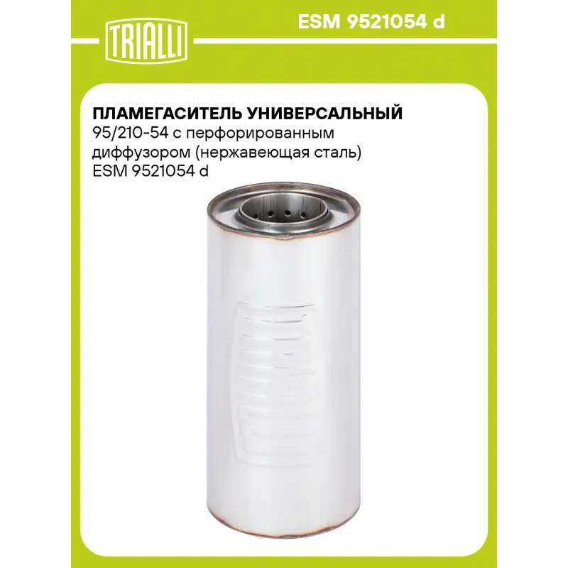 Пламегаситель универсальный 95/210-54 с перфорированным диффузором (нержавеющая сталь) Характеристики: Артикул: ESM 9521054 d OEM номера: 9521054 d Материал: Нержавеющая сталь AISI 430 Особенности конструкции:: Труба перфорированная с диффузором, шерсть нержавеющая, набивка жаро-шумопоглощающая Длина, мм: 210 Диаметр корпуса, мм... Читать полностью →