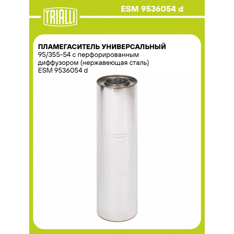 Пламегаситель универсальный 95/355-54 с перфорированным диффузором (нержавеющая сталь) Характеристики: Артикул: ESM 9536054 d OEM номера: 9536054 d Материал: Нержавеющая сталь AISI 430 Особенности конструкции:: Труба перфорированная с диффузором, шерсть нержавеющая, набивка жаро-шумопоглощающая Длина, мм: 355 Диаметр корпуса, мм... Читать полностью →
