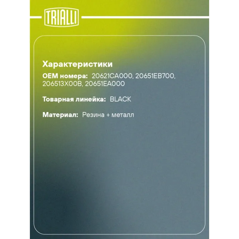 Подвес (подушка) глушителя для автомобилей Nissan Pathfinder (05-) (1 шт.) Характеристики: Артикул: RM 0209 OEM номера: 20621CA000, 20651EB700, 206513X00B, 20651EA000 Материал: Резина + металл Гарантийный срок: 2 года/60 тыс. Товарная линейка: BLACK Комплектация: Подвес глушителя - 1 шт Гарантия: от 1 года.