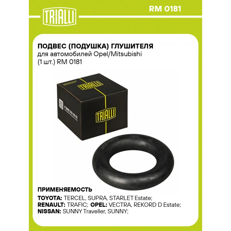 Подвес (подушка) глушителя для автомобилей Opel/Mitsubishi (1 шт.) Характеристики: Артикул: RM 0181 OEM номера: 9030136001, MB059522, MB313732, 9275338, 9030136002, 2868921000 Гарантийный срок: 2 года/60 тыс. Материал: Резина Товарная линейка: BLACK Комплектация: Подвес глушителя - 1 шт Гарантия: от 1 года.