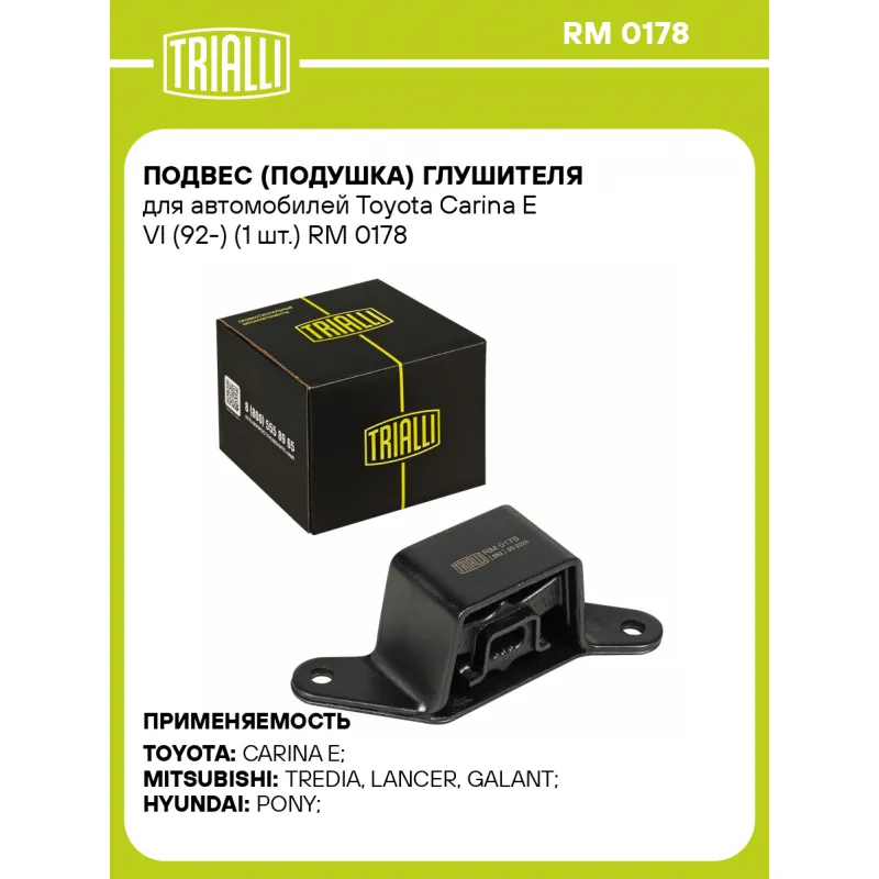 Подвес (подушка) глушителя для автомобилей Toyota Carina E VI (92-) (1 шт.) Характеристики: Артикул: RM 0178 OEM номера: 1757174333 Материал: Резина + металл Гарантийный срок: 2 года/60 тыс. Товарная линейка: BLACK Комплектация: Подвес глушителя - 1 шт Гарантия: от 1 года.