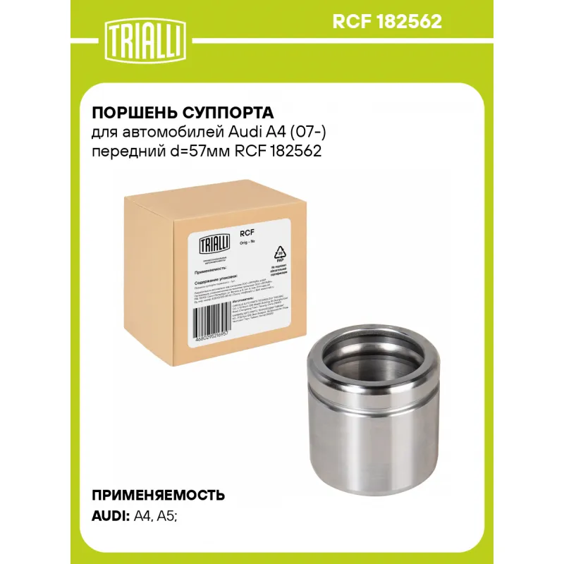 Поршень суппорта для автомобилей Audi A4 (07-) передний d=57мм Характеристики: Артикул: RCF 182562 OEM номера: 8K0615123C, 8K0 615 123F, 8K0615124C, 8K0 615 124 F Тормозная система: ATE Диаметр, мм: 57 Сторона установки: Передняя ось Сопутствующие товары: Суппорты тормозные: CF 182561, CF 182562 Сопутствующие товары: Ремкомплекты суппорта: RCF 182561 Количество на автомобиль: 2 Высота, мм: 56 Гарантийный срок: 2 года / 60 000 км Товарная линейка: BLACK Комплектация: Поршень суппорта тормозного - 1 шт Гарантия: от 1 года.