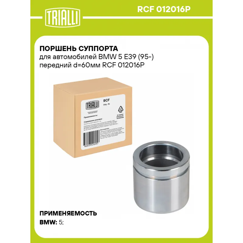 Поршень суппорта для автомобилей BMW 5 E39 (95-) передний d=60мм Характеристики: Артикул: RCF 012016P OEM номера: 34 11 1 163 385, 34 11 1 163 386 Тормозная система: ATE Диаметр, мм: 60 Гарантийный срок: 2 года / 60 000 км Сторона установки: Передняя ось Сопутствующие товары: Суппорты тормозные: CF 012016, CF 012017 Сопутствующие товары: Ремкомплекты суппорта: RCF 012016 Сопутствующие товары: Скобы суппорта: CF 012018 Количество на автомобиль: 2 Высота, мм: 56 Товарная линейка: BLACK Комплектация: Поршень суппорта тормозного - 1 шт Гарантия: от 1 года.