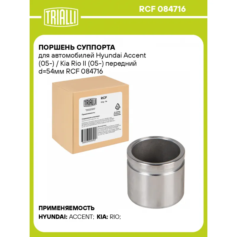 Поршень суппорта для автомобилей Hyundai Accent (05-) / Kia Rio II (05-) передний d=54мм Характеристики: Артикул: RCF 084716 OEM номера: 581101G100, 581801GA00, 581301G100, 581901GA00 Тормозная система: Kasco Диаметр, мм: 54 Сторона установки: Передняя ось Сопутствующие товары: Суппорты тормозные: CF 084715, CF 084716 Сопутствующие товары: Ремкомплекты суппорта: RCF 084715 Количество на автомобиль: 2 Высота, мм: 47 Гарантийный срок: 2 года / 60 000 км Товарная линейка: BLACK Комплектация: Поршень суппорта тормозного - 1 шт Гарантия: от 1 года.