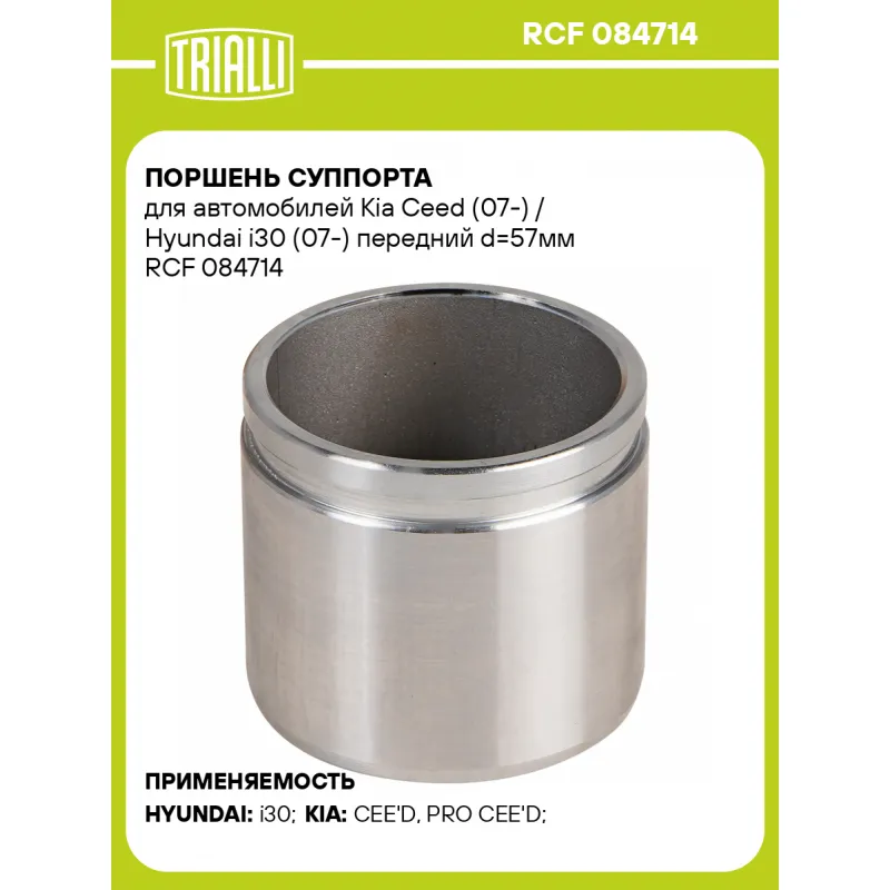 Поршень суппорта для автомобилей Kia Ceed (07-) / Hyundai i30 (07-) передний d=57мм Характеристики: Артикул: RCF 084714 OEM номера: 581101H000, 581101H100, 581801HA00, 581301H000, 581901HA00 Тормозная система: MOBIS Диаметр, мм: 57 Сторона установки: Передняя ось Сопутствующие товары: Суппорты тормозные: CF 084713, CF 084714 Сопутствующие товары: Ремкомплекты суппорта: RCF 084713 Количество на автомобиль: 2 Высота, мм: 51 Гарантийный срок: 2 года / 60 000 км Товарная линейка: BLACK Комплектация: Поршень суппорта тормозного - 1 шт Гарантия: от 1 года.