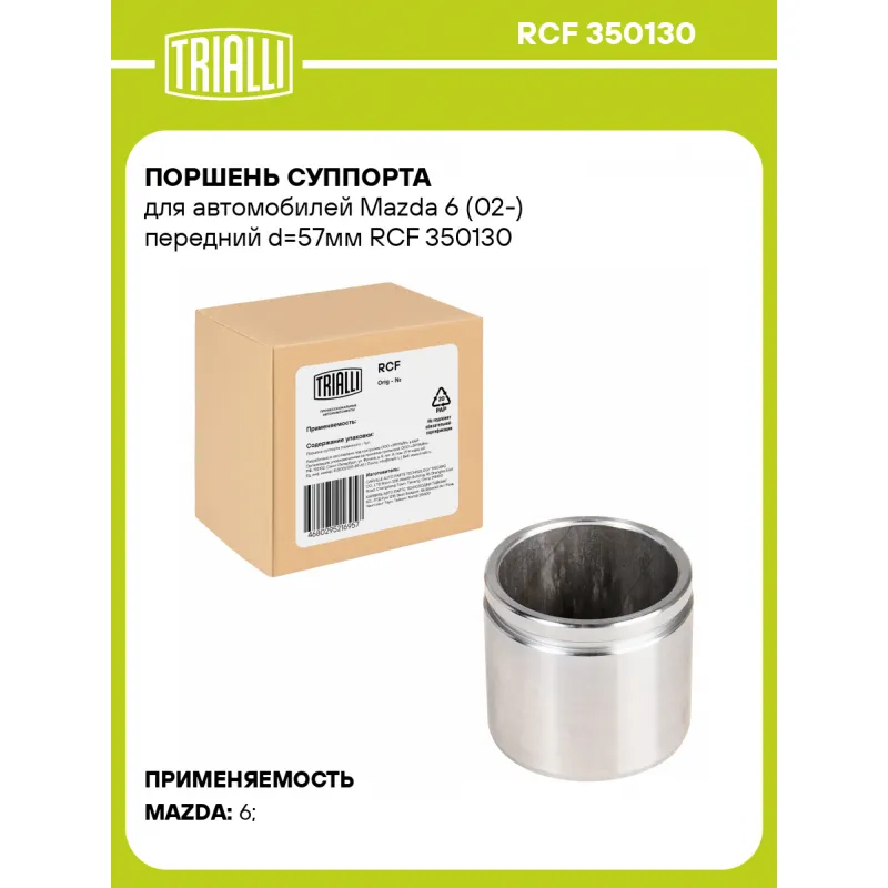 Поршень суппорта для автомобилей Mazda 6 (02-) передний d=57мм Характеристики: Артикул: RCF 350130 OEM номера: GJ6E3361XB, GJ6E3371XB, GJ6E3371XC, GJ6E3361XC Тормозная система: NBK Диаметр, мм: 57 Сторона установки: Передняя ось Сопутствующие товары: Суппорты тормозные: CF 350129, CF 350130 Сопутствующие товары: Ремкомплекты суппорта: RCF 350129 Количество на автомобиль: 2 Высота, мм: 52 Гарантийный срок: 2 года / 60 000 км Товарная линейка: BLACK Комплектация: Поршень суппорта тормозного - 1 шт Гарантия: от 1 года.