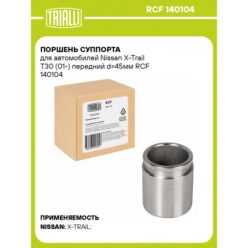 Поршень суппорта для автомобилей Nissan X-Trail T30 (01-) передний d=45мм Характеристики: Артикул: RCF 140104 OEM номера: 41011-8H300, 41011-8H30A, 41001-8H300, 41001-8H30A Тормозная система: Akebono Диаметр, мм: 45 Сторона установки: Передняя ось Сопутствующие товары: Суппорты тормозные: CF 140103, CF 140104 Сопутствующие товары: Ремкомплекты суппорта: RCF 140103 Количество на автомобиль: 2 Высота, мм: 52 Гарантийный срок: 2 года / 60 000 км Товарная линейка: BLACK Комплектация: Поршень суппорта тормозного - 1 шт Гарантия: от 1 года.