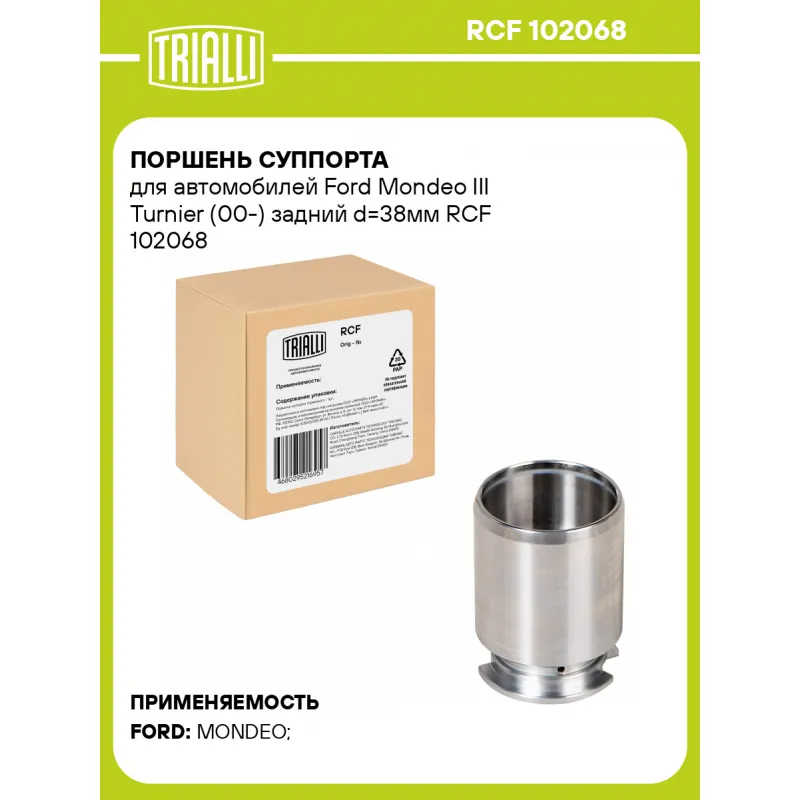 Поршень суппорта для автомобилей Ford Mondeo III Turnier (00-) задний d=38мм Характеристики: Артикул: RCF 102068 OEM номера: 1133215, 1133216, 1121851, 1144078, 1522077 Тормозная система: BOSCH Диаметр, мм: 38 Сторона установки: Задняя ось Сопутствующие товары: Суппорты тормозные: CF 102067, CF 102068 Сопутствующие товары: Ремкомплекты суппорта: RCF 102068 Количество на автомобиль: 2 Высота, мм: 51 Гарантийный срок: 2 года / 60 000 км Товарная линейка: BLACK Комплектация: Поршень суппорта тормозного - 1 шт Гарантия: от 1 года.