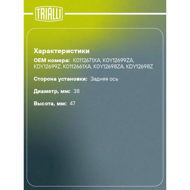 Поршень суппорта для автомобилей Mazda CX-5 (12-) задний d=38мм Характеристики: Артикул: RCF 206202 OEM номера: K0112671XA, K0Y12699ZA, KDY12699Z, K0112661XA, K0Y12698ZA, KDY12698Z Высота, мм: 47 Тормозная система: AKEBONO Диаметр, мм: 38 Гарантийный срок: 2 года / 60 000 км Сторона установки: Задняя ось Сопутствующие товары: Суппорты тормозные: CF 206201, CF 206202 Сопутствующие товары: Ремкомплекты суппорта: RCF 206201 Сопутствующие товары: Скобы суппорта: CF 206203 Количество на автомобиль: 2 Товарная линейка: BLACK Комплектация: Поршень суппорта тормозного - 1 шт Гарантия: от 1 года.