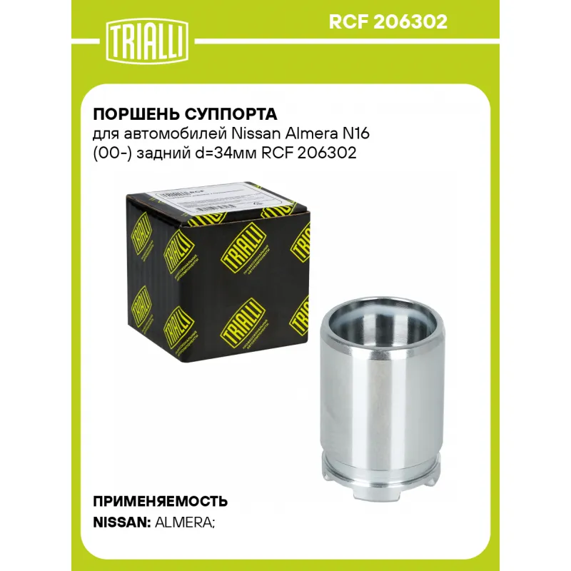 Поршень суппорта для автомобилей Nissan Almera N16 (00-) задний d=34мм Характеристики: Артикул: RCF 206302 OEM номера: 44011 BM500, 44001 BM500, 44011-BM50A, 44001-BM50A Высота, мм: 47 Тормозная система: TRW Диаметр, мм: 34 Гарантийный срок: 2 года / 60 000 км Сторона установки: Задняя ось Сопутствующие товары: Суппорты тормозные: CF 206301, CF 206302 Сопутствующие товары: Ремкомплекты суппорта: RCF 206301 Сопутствующие товары: Скобы суппорта: CF 206303 Количество на автомобиль: 2 Товарная линейка: BLACK Комплектация: Поршень суппорта тормозного - 1 шт Гарантия: от 1 года.