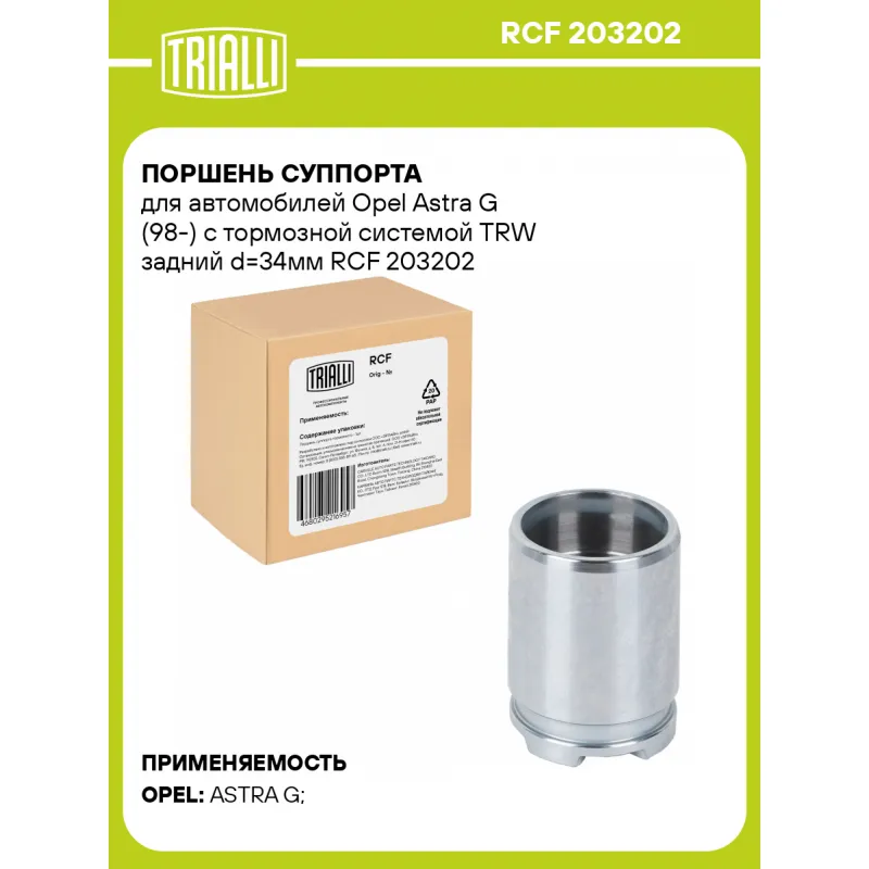 Поршень суппорта для автомобилей Opel Astra G (98-) с тормозной системой TRW задний d=34мм Характеристики: Артикул: RCF 203202 OEM номера: 5 42 473, 5 42 474, 93179154, 93179155 Высота, мм: 47 Тормозная система: TRW Диаметр, мм: 34 Гарантийный срок: 2 года / 60 000 км Сторона установки: Задняя ось Сопутствующие товары: Суппорты тормозные: CF 203201, CF 203202 Сопутствующие товары: Ремкомплекты суппорта: RCF 203201 Сопутствующие товары: Скобы суппорта: CF 203203 Количество на автомобиль: 2 Товарная линейка: BLACK Комплектация: Поршень суппорта тормозного - 1 шт Гарантия: от 1 года.