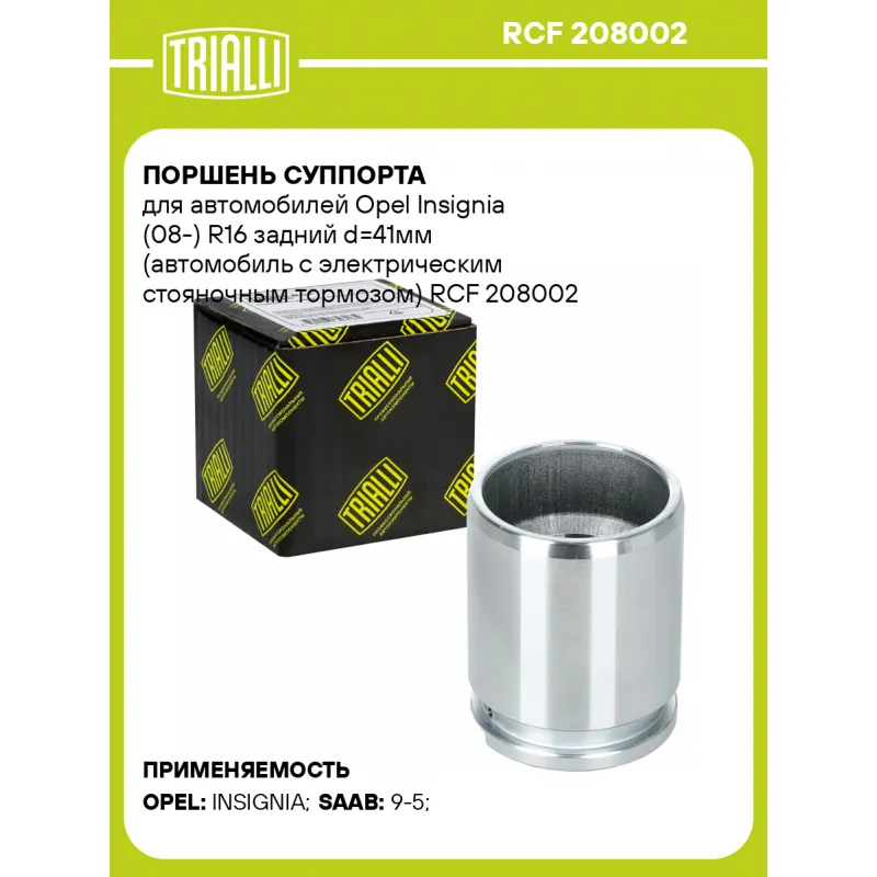 Поршень суппорта для автомобилей Opel Insignia (08-) R16 задний d=41мм (автомобиль с электрическим стояночным тормозом) Характеристики: Артикул: RCF 208002 OEM номера: 13343569, 13275927, 5 42 154, 5 42 168, 13343570, 13275928, 5 42 156, 5 42 169 Особенности конструкции:: Для диска 12мм Высота, мм: 51 Тормозная система: TRW Диаметр, мм: 41 Гарантийный срок: 2 года / 60 000 км Сторона установки: Задняя ось Сопутствующие товары: Суппорты тормозные: CF 208001, CF 208002 Сопутствующие товары: Ремкомплекты суппорта: RCF 208001 Сопутствующие товары: Скобы суппорта: CF 208003 Количество на автомобиль: 2 Товарная линейка: BLACK Комплектация: Поршень суппорта тормозного - 1 шт Гарантия: от 1 года.
