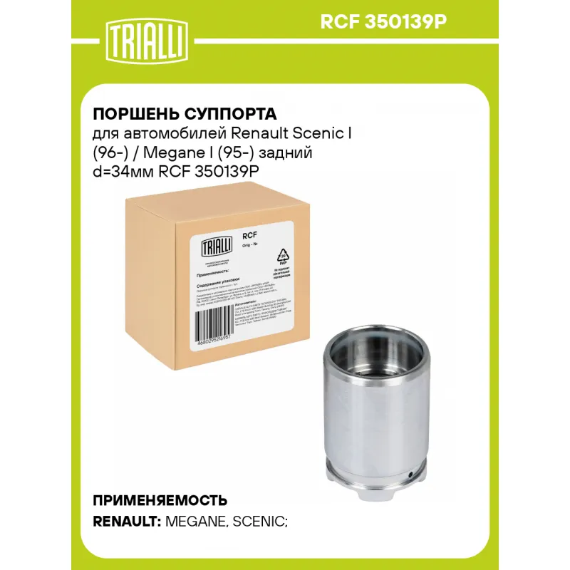 Поршень суппорта для автомобилей Renault Scenic I (96-) / Megane I (95-) задний d=34мм Характеристики: Артикул: RCF 350139P OEM номера: 7701 206 344, 7711135719, 7701 206 345, 7711135720 Тормозная система: TRW Диаметр, мм: 34 Гарантийный срок: 2 года / 60 000 км Сторона установки: Задняя ось Сопутствующие товары: Суппорты тормозные: CF 350138, CF 350139 Сопутствующие товары: Ремкомплекты суппорта: RCF 350139 Сопутствующие товары: Скобы суппорта: CF 800975 Количество на автомобиль: 2 Высота, мм: 47 Товарная линейка: BLACK Комплектация: Поршень суппорта тормозного - 1 шт Гарантия: от 1 года.