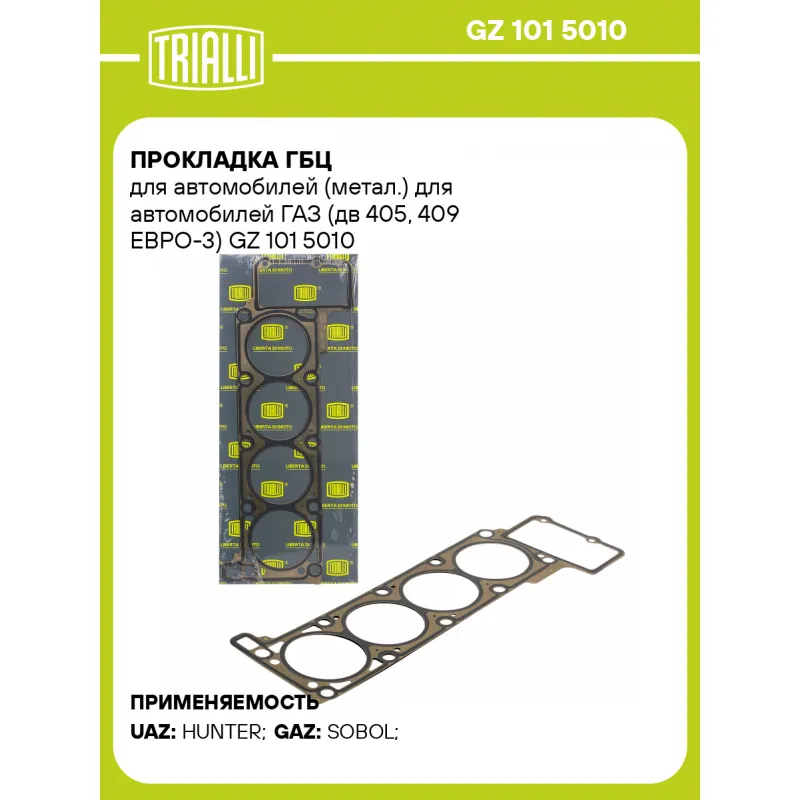 Прокладка ГБЦ для автомобилей (метал.) для автомобилей ГАЗ (дв 405, 409 ЕВРО-3) Характеристики: Артикул: GZ 101 5010 OEM номера: 40624100302003 Гарантийный срок: 2 года/60 000 км. Кол-во слоев: 2 Количество на автомобиль: 1 Толщина, мм (номинальная): 1,0 Ширина в затяге, мм: 0.52 Диаметр (мм): 96.5 Комплектация: Прокладка ГБЦ... Читать полностью →