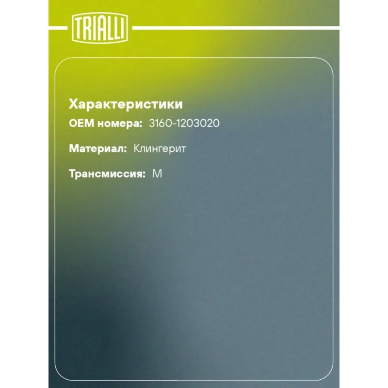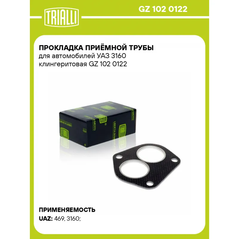Прокладка приёмной трубы для автомобилей УАЗ 3160 клингеритовая Характеристики: Артикул: GZ 102 0122 OEM номера: 3160-1203020 Гарантийный срок: 2 года/60 000 км. Количество на автомобиль: 1 Сопутствующие товары:: GZ 101 7017 Материал: Клингерит Трансмиссия: М ABS: - Подходит для авто: УАЗ 469 (72-), 3160 (97-), 3160 (97-) Для проверки применяемости отправьте VIN автомобиля через вкладку "Есть вопросы о товаре?" Комплектация: Прокладка приёмной трубы - 50 шт Гарантия: от 1 года.