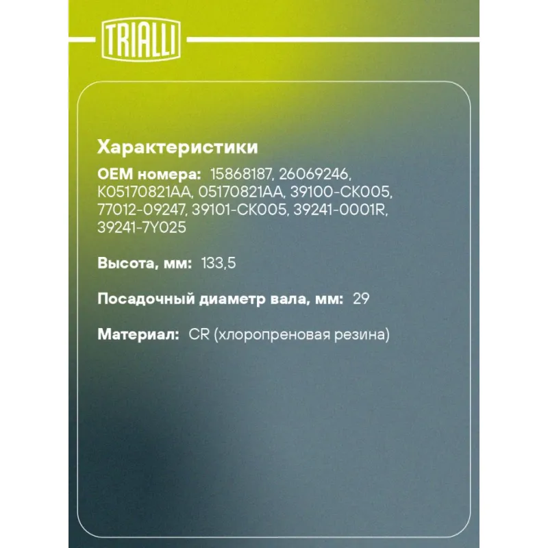Пыльник ШРУСа наружного для автомобилей Chevrolet Tahoe (GMT900) (07-) Характеристики: Артикул: FG 0505 OEM номера: 15868187, 26069246, K05170821AA, 05170821AA, 39100-CK005, 77012-09247, 39101-CK005, 39241-0001R, 39241-7Y025 Гарантийный срок: 1 год/30 000 км Сторона установки: со стороны колеса, передняя ось Количество на автомобиль: 2 Высота, мм: 133,5 Наружный диаметр ШРУСа, мм: 99 Посадочный диаметр вала, мм: 29 Материал: CR (хлоропреновая резина) Товарная линейка: BLACK Подходит для авто: Chevrolet Silverado 1500 (07-), Suburban GMT 900 (07-), Tahoe (06-) Dodge RAM 1500 (08-) Для проверки применяемости отправьте VIN автомобиля через вкладку "Есть вопросы о товаре?" Комплектация: Чехол ШРУС - 1 шт Хомут - 2 шт Смазка - 1 туба Гарантия: от 1 года.