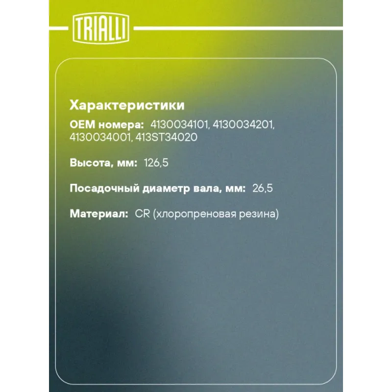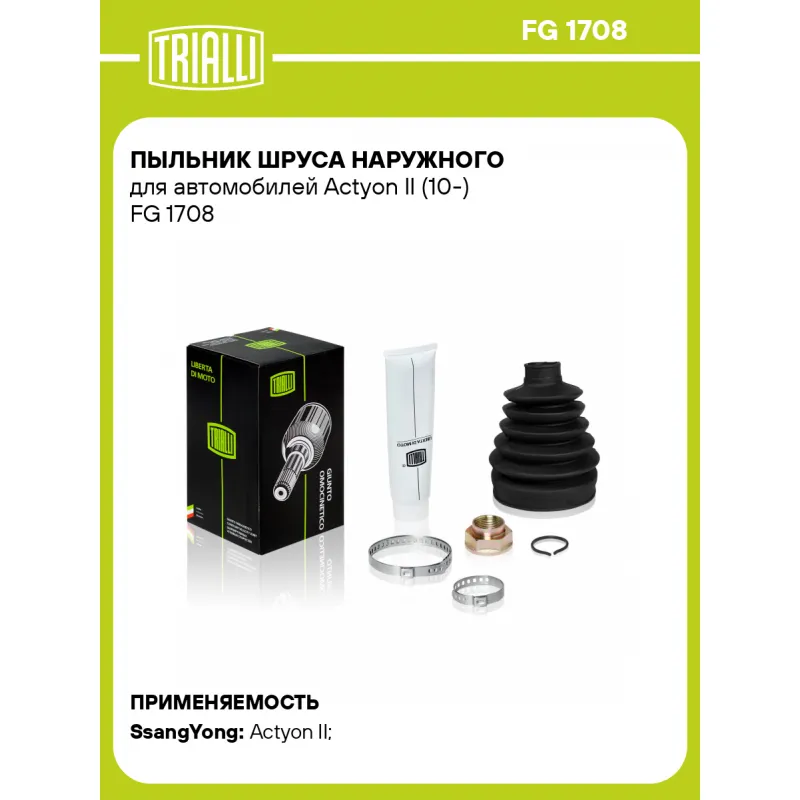 Пыльник ШРУСа наружного для автомобилей Actyon II (10-) Характеристики: Артикул: FG 1708 OEM номера: 4130034101, 4130034201, 4130034001, 413ST34020 Сторона установки: со стороны колеса, передняя ось Количество на автомобиль: 2 Сопутствующие товары:: GO 1710, AR 1707 Высота, мм: 126.5 Гарантийный срок: 1 год/30 000 км Наружный диаметр ШРУСа, мм: 87 Посадочный диаметр вала, мм: 26,5 Материал: CR (хлоропреновая резина) Товарная линейка: BLACK Подходит для авто: SsangYong Actyon II (10-) Для проверки применяемости отправьте VIN автомобиля через вкладку "Есть вопросы о товаре?" Комплектация: Чехол ШРУСа - 1 шт Стопорное кольцо - 1 шт Хомут - 2 шт Гайка - 1 шт Тюбик со смазкой - 1 шт Гарантия: от 1 года.