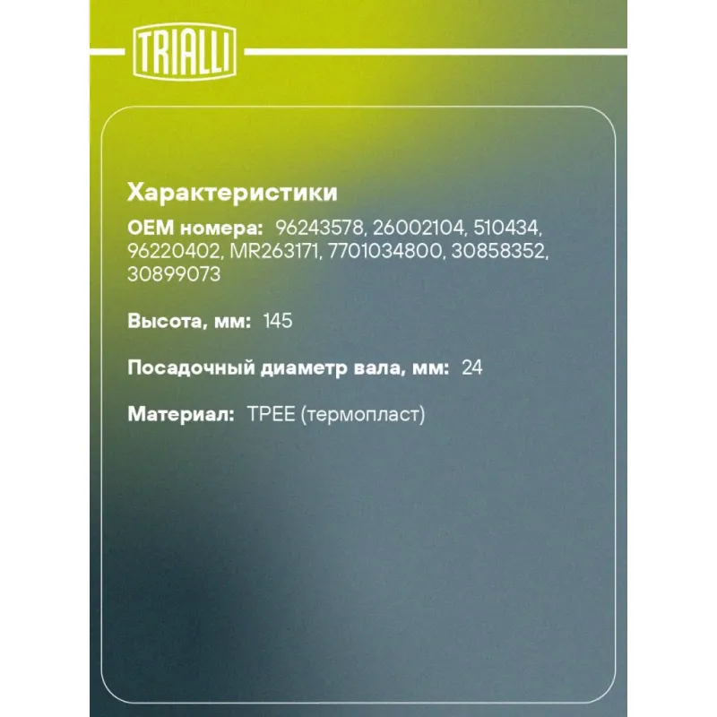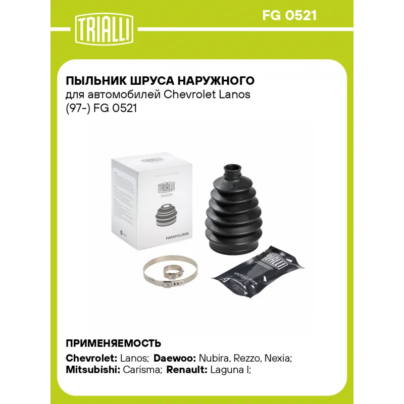 Пыльник ШРУСа наружного для автомобилей Chevrolet Lanos (97-) Характеристики: Артикул: FG 0521 OEM номера: 96243578, 26002104, 510434, 96220402, MR263171, 7701034800, 30858352, 30899073 Гарантийный срок: 1 год/30 000 км Сторона установки: со стороны колеса, передняя ось Количество на автомобиль: 2 Высота, мм: 145 Наружный диаметр ШРУСа, мм: 83,5 Посадочный диаметр вала, мм: 24 Сопутствующий товар: ШРУСы: GO 203 Материал: TPEE (термопласт) Товарная линейка: BLACK Подходит для авто: Chevrolet Lanos (97-), Lanos (97-) Daewoo Nubira (97-), Rezzo (00-), Nexia (94-) Mitsubishi Carisma (95-) Renault Laguna I (94-) Для проверки применяемости отправьте VIN автомобиля через вкладку "Есть вопросы о товаре?" Комплектация: Чехол ШРУСа - 1 шт Хомут - 2 шт Смазка - 1 туба Гарантия: от 1 года.