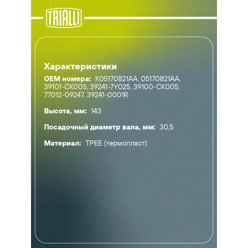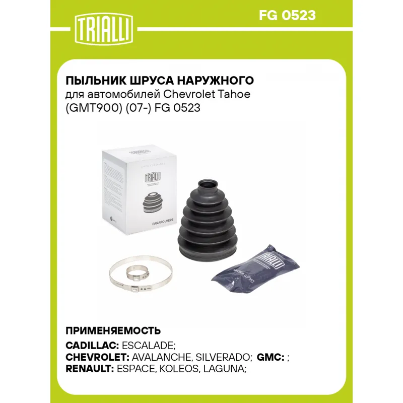 Пыльник ШРУСа наружного для автомобилей Chevrolet Tahoe (GMT900) (07-) Характеристики: Артикул: FG 0523 OEM номера: K05170821AA, 05170821AA, 39101-CK005, 39241-7Y025, 39100-CK005, 77012-09247, 39241-0001R Гарантийный срок: 1 год/30 000 км Сторона установки: со стороны колеса, передняя ось Количество на автомобиль: 2 Высота, мм: 143 Наружный диаметр ШРУСа, мм: 99.5 Посадочный диаметр вала, мм: 30.5 Материал: TPEE (термопласт) Товарная линейка: BLACK Комплектация: Чехол ШРУСа - 1 шт Хомут - 2 шт Смазка - 1 туба Гарантия: от 1 года.