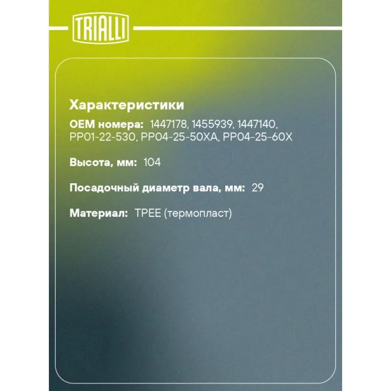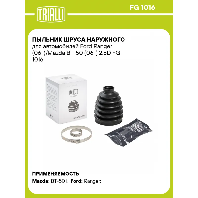 Пыльник ШРУСа наружного для автомобилей Ford Ranger (06-)/Mazda BT-50 (06-) 2.5D Характеристики: Артикул: FG 1016 OEM номера: 1447178, 1455939, 1447140, PP01-22-530, PP04-25-50XA, PP04-25-60X Сторона установки: со стороны колеса, передняя ось Количество на автомобиль: 2 Высота, мм: 104 Гарантийный срок: 1 год/30 000 км Наружный диаметр ШРУСа, мм: 86.5 Посадочный диаметр вала, мм: 29 Сопутствующий товар: ШРУСы: GO 1012 Материал: TPEE (термопласт) Товарная линейка: BLACK Подходит для авто: Mazda BT-50 I (06-) Ford Ranger (06-) Для проверки применяемости отправьте VIN автомобиля через вкладку "Есть вопросы о товаре?" Комплектация: Чехол ШРУСа - 1 шт Хомут - 2 шт Смазка - 1 туба Гарантия: от 1 года.