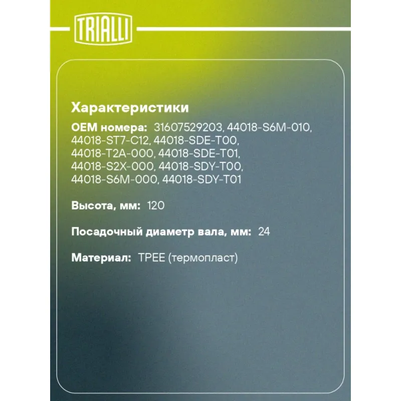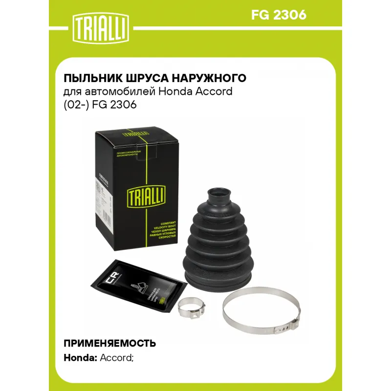 Пыльник ШРУСа наружного для автомобилей Honda Accord (02-) Характеристики: Артикул: FG 2306 OEM номера: 31607529203, 44018-S6M-010, 44018-ST7-C12, 44018-SDE-T00, 44018-T2A-000, 44018-SDE-T01, 44018-S2X-000, 44018-SDY-T00, 44018-S6M-000, 44018-SDY-T01, 04438-YZZC1, 04438-05121, 04438-05190 Сторона установки: со стороны колеса, передняя ось Количество на автомобиль: 2 Высота, мм: 120 Гарантийный срок: 1 год/30 000 км Наружный диаметр ШРУСа, мм: 82.6 Посадочный диаметр вала, мм: 24 Материал: TPEE (термопласт) Товарная линейка: BLACK Подходит для авто: Honda Accord (02-) Для проверки применяемости отправьте VIN автомобиля через вкладку "Есть вопросы о товаре?" Комплектация: Чехол ШРУСа - 1 шт Хомут - 2 шт Смазка - 1 туба Гарантия: от 1 года.
