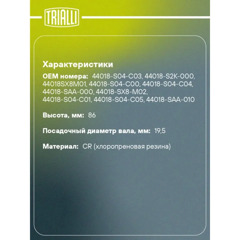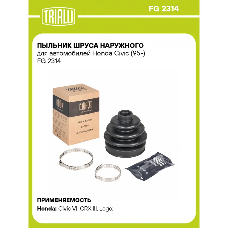 Пыльник ШРУСа наружного для автомобилей Honda Civic (95-) Характеристики: Артикул: FG 2314 OEM номера: 44018-S04-C03, 44018-S2K-000, 44018SX8M01, 44018-S04-C00, 44018-S04-C04, 44018-SAA-000, 44018-SX8-M02, 44018-S04-C01, 44018-S04-C05, 44018-SAA-010, 44018-S04-C02, 44018S04C06, 44018SAA020 Сторона установки: со стороны колеса, передняя ось Количество на автомобиль: 2 Высота, мм: 86 Гарантийный срок: 1 год/30 000 км Наружный диаметр ШРУСа, мм: 77 Посадочный диаметр вала, мм: 19.5 Материал: CR (хлоропреновая резина) Товарная линейка: BLACK Подходит для авто: Honda Civic VI (95-), CRX III (92-), Logo (96-) Для проверки применяемости отправьте VIN автомобиля через вкладку "Есть вопросы о товаре?" Комплектация: Чехол ШРУС - 1 шт Хомут - 2 шт Смазка - 1 шт Гарантия: от 1 года.
