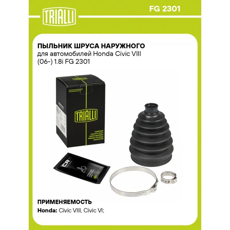 Пыльник ШРУСа наружного для автомобилей Honda Civic VIII (06-) 1.8i Характеристики: Артикул: FG 2301 OEM номера: 44018-SAB-N02, 44306-SNC-000, 44018-SEL-T02, 44014-SNA-010, 44305-SNC-000, 44018-SAB-N20, 44014-SNA-000, 44306SNA900, 44305SAAE00, 44306SAAE00, 44305SNA000, 44018-SEN-P01, 44018-S6D-G00, 44018-SEL-T00, 44014-SAB-N22, 44018-SAB-N01, 44018-SEL-T01, 44306-SNC-010, 44018-SEN-P00, 44018-S04-N00, 44305-SNC-010, 44018-SAB-N21, 44014-SAB-N21 Сторона установки: со стороны колеса, передняя ось Количество на автомобиль: 2 Высота, мм: 112 Гарантийный срок: 1 год/30 000 км Наружный диаметр ШРУСа, мм: 81.2 Посадочный диаметр вала, мм: 21.8 Материал: TPEE (термопласт) Товарная линейка: BLACK Подходит для авто: Honda Civic VIII (06-), Civic VI (95-), Civic VII (00-), Jazz (01-) Для проверки применяемости отправьте VIN автомобиля через вкладку "Есть вопросы о товаре?" Комплектация: Чехол ШРУСа - 1 шт Хомут - 2 шт Смазка - 1 туба Гарантия: от 1 года.