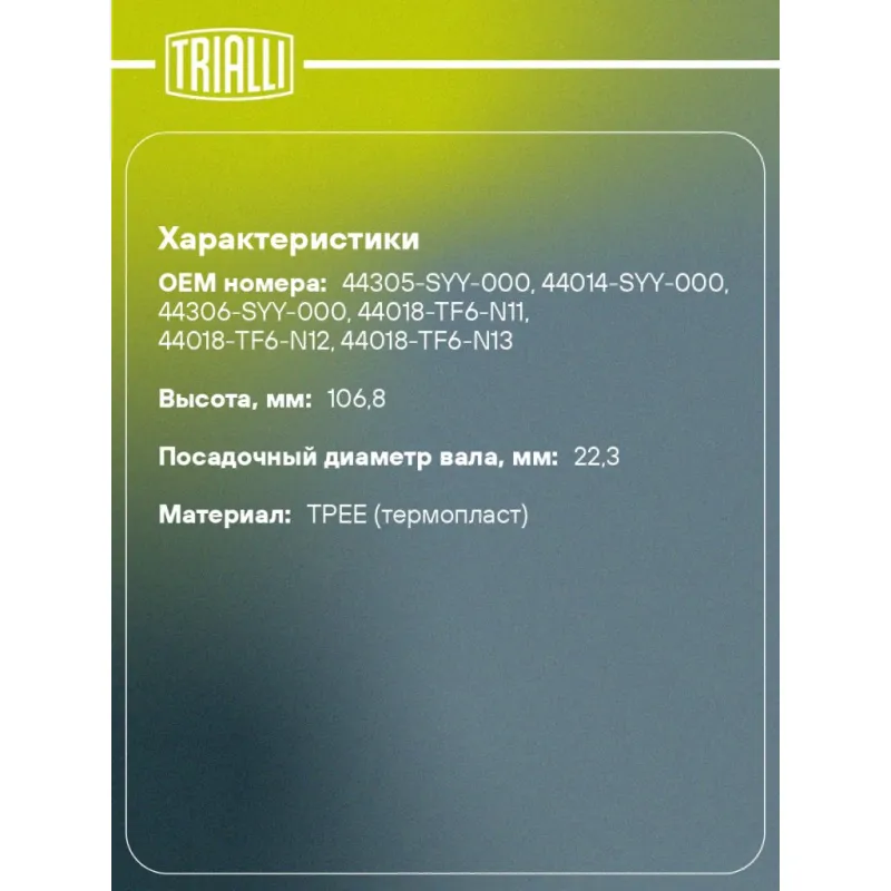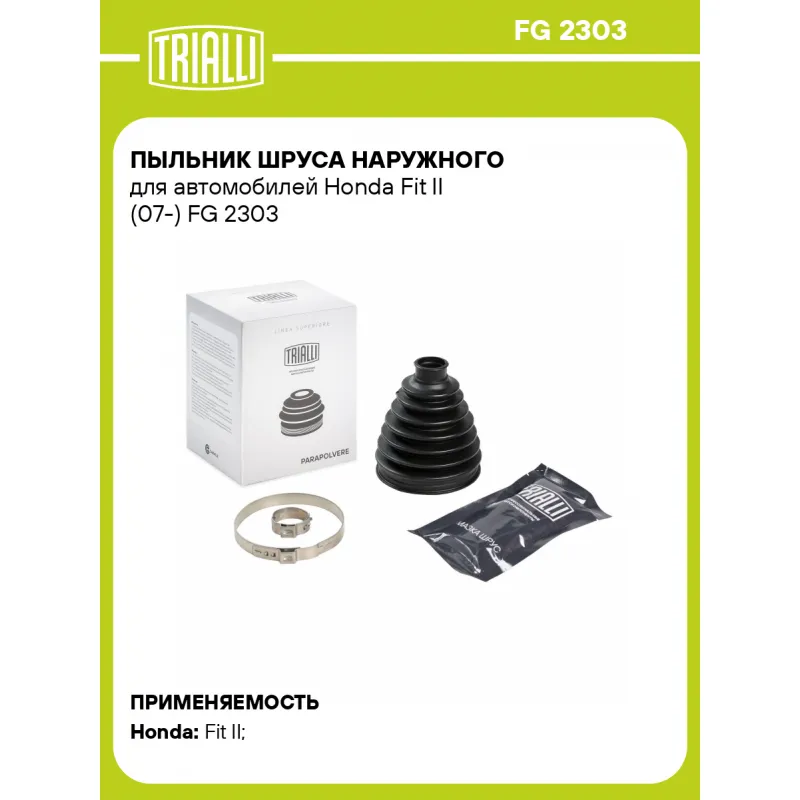 Пыльник ШРУСа наружного для автомобилей Honda Fit II (07-) Характеристики: Артикул: FG 2303 OEM номера: 44305-SYY-000, 44014-SYY-000, 44306-SYY-000, 44018-TF6-N11, 44018-TF6-N12, 44018-TF6-N13 Сторона установки: со стороны колеса, передняя ось Количество на автомобиль: 2 Высота, мм: 106.8 Гарантийный срок: 1 год/30 000 км Наружный диаметр ШРУСа, мм: 76.6 Посадочный диаметр вала, мм: 22.3 Материал: TPEE (термопласт) Товарная линейка: BLACK Подходит для авто: Honda Fit II (07-) Для проверки применяемости отправьте VIN автомобиля через вкладку "Есть вопросы о товаре?" Комплектация: Чехол ШРУСа - 1 шт Хомут - 2 шт Смазка - 1 туба Гарантия: от 1 года.