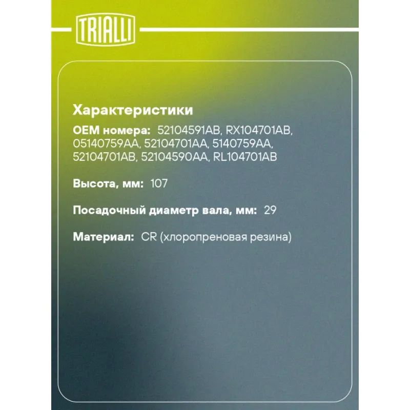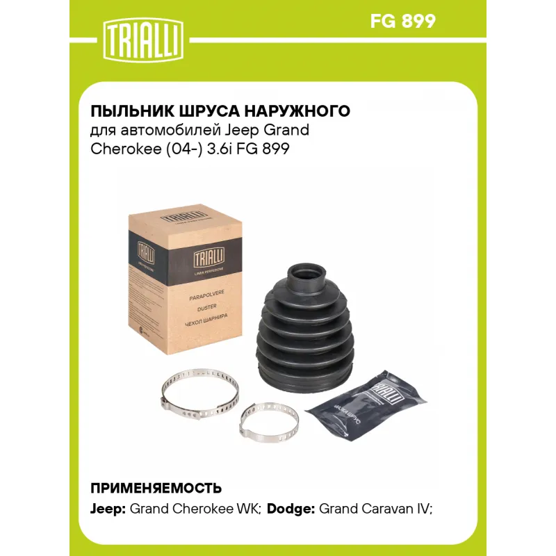 Пыльник ШРУСа наружного для автомобилей Jeep Grand Cherokee (04-) 3.6i Характеристики: Артикул: FG 899 OEM номера: 52104591AB, RX104701AB, 05140759AA, 52104701AA, 5140759AA, 52104701AB, 52104590AA, RL104701AB Сторона установки: со стороны колеса, передняя ось Количество на автомобиль: 2 Высота, мм: 107 Гарантийный срок: 1 год/30 000 км Наружный диаметр ШРУСа, мм: 88,5 Посадочный диаметр вала, мм: 29 Материал: CR (хлоропреновая резина) Товарная линейка: BLACK Подходит для авто: Jeep Grand Cherokee WK (04-), Grand Cherokee WK2 (10-) Dodge Grand Caravan IV (00-), Grand Caravan V (07-) Для проверки применяемости отправьте VIN автомобиля через вкладку "Есть вопросы о товаре?" Комплектация: Чехол ШРУСа - 1 шт Хомут - 2 шт Смазка - 1 туба Гарантия: от 1 года.