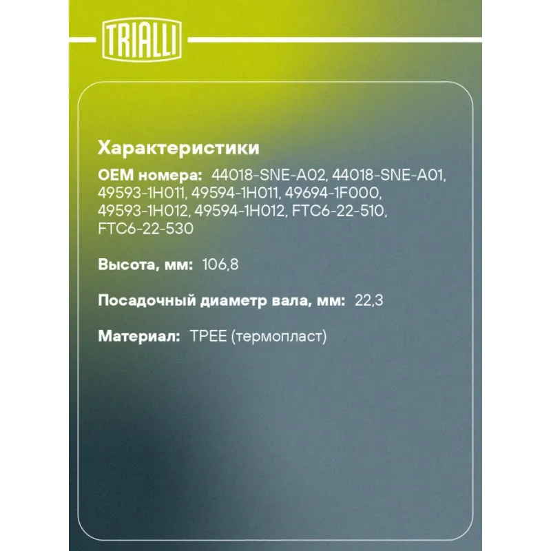 Пыльник ШРУСа наружного для автомобилей Kia Ceed (ED) (06-) Характеристики: Артикул: FG 2307 OEM номера: 44018-SNE-A02, 44018-SNE-A01, 49593-1H011, 49594-1H011, 49694-1F000, 49593-1H012, 49594-1H012, FTC6-22-510, FTC6-22-530 Сторона установки: со стороны колеса, передняя ось Количество на автомобиль: 2 Высота, мм: 106.8 Гарантийный срок: 1 год/30 000 км Наружный диаметр ШРУСа, мм: 76.6 Посадочный диаметр вала, мм: 22.3 Материал: TPEE (термопласт) Товарная линейка: BLACK Комплектация: Чехол ШРУСа - 1 шт Хомут - 2 шт Смазка - 1 туба Гарантия: от 1 года.