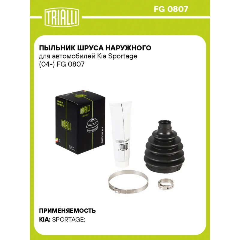 Пыльник ШРУСа наружного для автомобилей Kia Sportage (04-) Характеристики: Артикул: FG 0807 OEM номера: MR980368, MN156649, MR980367, MN156652, 49594-1F200, 49691-1F000, 49591-1F010, 49691-1F001, 496001F001 Гарантийный срок: 1 год/30 000 км Сторона установки: со стороны колеса, передняя ось Количество на автомобиль: 2 Высота, мм: 111 Наружный диаметр ШРУСа, мм: 80.3 Посадочный диаметр вала, мм: 24 Сопутствующий товар: ШРУСы: GO 0867 Материал: TPEE (термопласт) Товарная линейка: BLACK Комплектация: Чехол ШРУСа - 1 шт Хомут - 2 шт Смазка - 1 туба Гарантия: от 1 года.