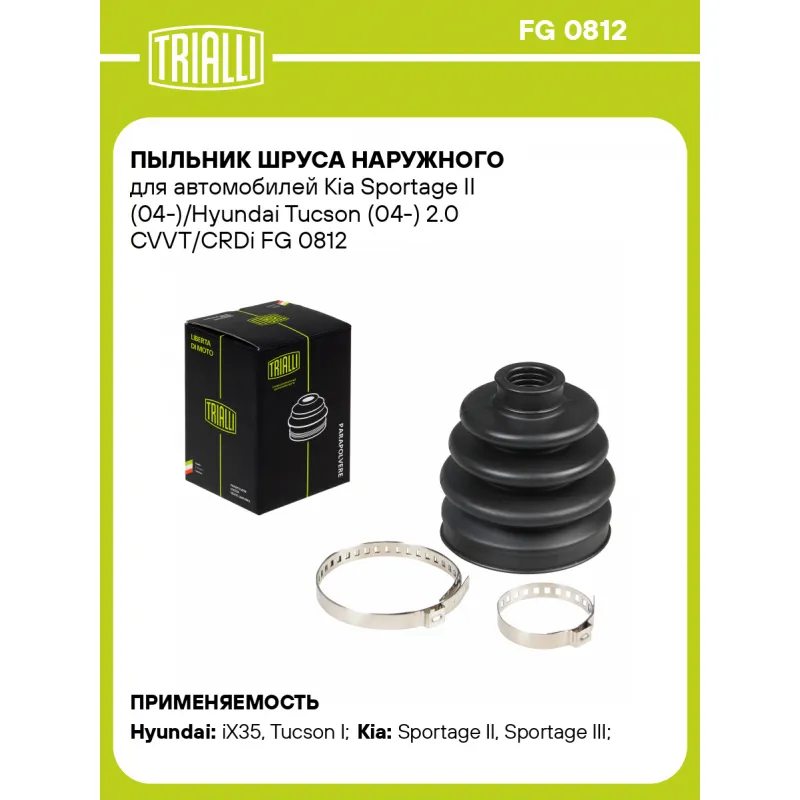 Пыльник ШРУСа наружного для автомобилей Kia Sportage II (04-)/Hyundai Tucson (04-) 2.0 CVVT/CRDi Характеристики: Артикул: FG 0812 OEM номера: 49506-2SA60, 49595-2Y600, S12-XLB3AH2203111A, 1542350, 2S61-4C062-BA Гарантийный срок: 1 год/30 000 км Сторона установки: со стороны колеса, задняя ось Количество на автомобиль: 2 Высота, мм: 83 Наружный диаметр ШРУСа, мм: 68 Посадочный диаметр вала, мм: 21 Сопутствующий товар: ШРУСы: GO 0874, GO 0877, GO 0814, GO 0801 Материал: CR (хлоропреновая резина) Товарная линейка: BLACK Подходит для авто: Hyundai iX35 (10-), Tucson I (04-), iX35 (10-) Kia Sportage II (04-), Sportage III (10-), Sportage III (10-) Для проверки применяемости отправьте VIN автомобиля через вкладку "Есть вопросы о товаре?" Комплектация: Чехол ШРУС - 1 шт Хомут - 2 шт Смазка - 1 туба Гарантия: от 1 года.