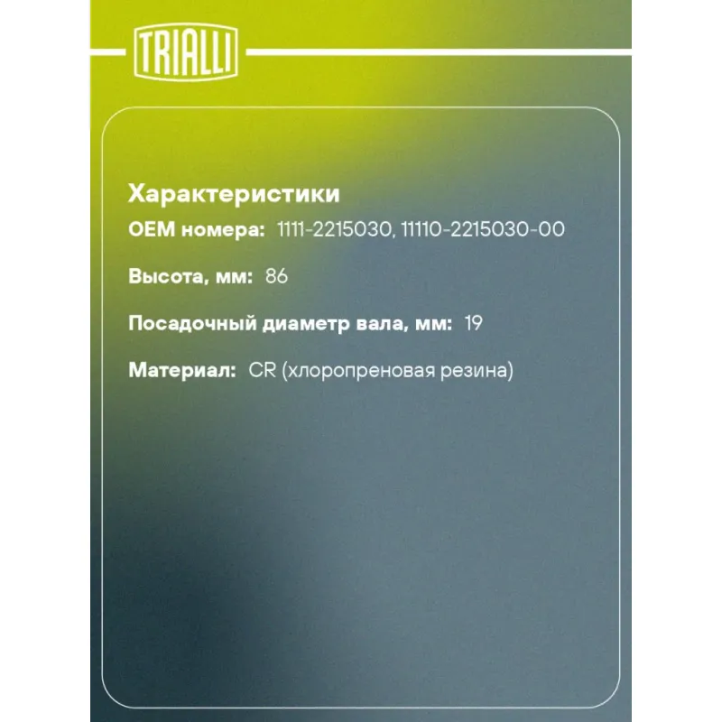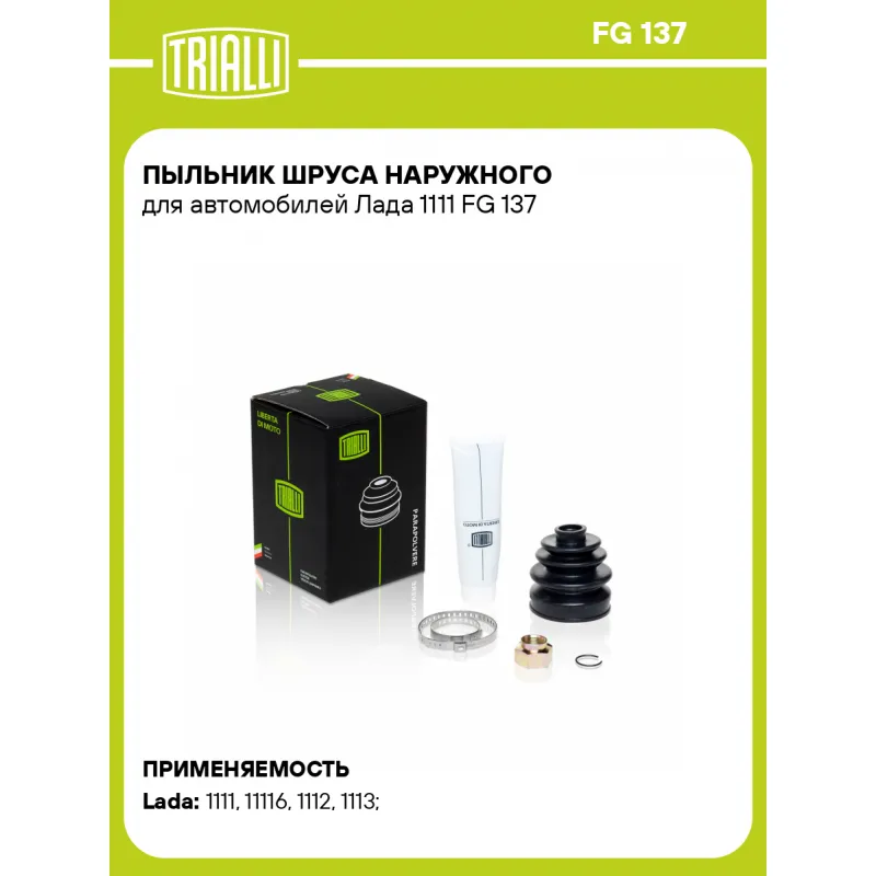 Пыльник ШРУСа наружного для автомобилей Лада 1111 Характеристики: Артикул: FG 137 OEM номера: 1111-2215030, 11110-2215030-00 Сторона установки: со стороны колеса, передняя ось Количество на автомобиль: 2 Высота, мм: 86 Гарантийный срок: 1 год/30 000 км Наружный диаметр ШРУСа, мм: 68 Посадочный диаметр вала, мм: 19 Материал: CR (хлоропреновая резина) Товарная линейка: BLACK Подходит для авто: ВАЗ 1111 (Ока), 11116, 1112, 1113 Для проверки применяемости отправьте VIN автомобиля через вкладку "Есть вопросы о товаре?" Комплектация: Чехол ШРУСа - 1 шт Стопорное кольцо - 1 шт Хомут - 2 шт Гайка - 1 шт Тюбик со смазкой - 1 шт Гарантийный талон - 1 шт Гарантия: от 1 года.
