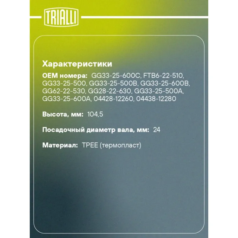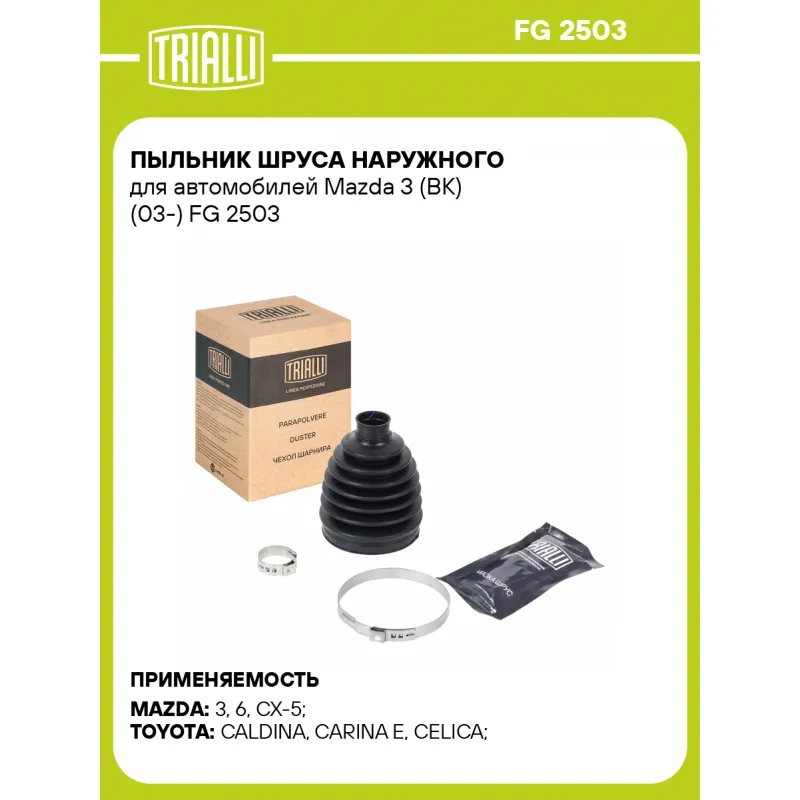 Пыльник ШРУСа наружного для автомобилей Mazda 3 (BK) (03-) Характеристики: Артикул: FG 2503 OEM номера: GG33-25-600C, FTB6-22-510, GG33-25-500, GG33-25-500B, GG33-25-600B, GG62-22-530, GG28-22-630, GG33-25-500A, GG33-25-600A, 04428-12260, 04438-12280, 04438-12610, 04438-12260, 04438-12420 Сторона установки: со стороны колеса, передняя ось Количество на автомобиль: 2 Высота, мм: 104.5 Гарантийный срок: 1 год/30 000 км Наружный диаметр ШРУСа, мм: 79 Посадочный диаметр вала, мм: 24 Материал: TPEE (термопласт) Товарная линейка: BLACK Комплектация: Чехол ШРУСа - 1 шт Хомут - 2 шт Смазка - 1 туба Гарантия: от 1 года.