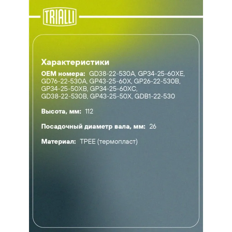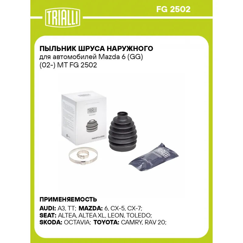 Пыльник ШРУСа наружного для автомобилей Mazda 6 (GG) (02-) MT Характеристики: Артикул: FG 2502 OEM номера: GD38-22-530A, GP34-25-60XE, GD76-22-530A, GP43-25-60X, GP26-22-530B, GP34-25-50XB, GP34-25-60XC, GD38-22-530B, GP43-25-50X, GDB1-22-530, GP34-22-530A, GP34-25-50XC, 191407285G, 191407285E, 1K0498203B Сторона установки: со стороны колеса, передняя ось Количество на автомобиль: 2 Высота, мм: 112 Гарантийный срок: 1 год/30 000 км Наружный диаметр ШРУСа, мм: 80 Посадочный диаметр вала, мм: 26 Материал: TPEE (термопласт) Товарная линейка: BLACK Комплектация: Чехол ШРУСа - 1 шт Хомут - 2 шт Смазка - 1 туба Гарантия: от 1 года.
