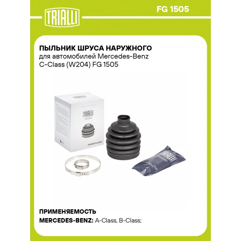 Пыльник ШРУСа наружного для автомобилей Mercedes-Benz C-Class (W204) Характеристики: Артикул: FG 1505 OEM номера: A1693660191, A2213300185, A2213302301, A2213306400, A1693601768, A2043300585, A2213301601, A2213306300, A1693600975, 1693600975, 1693601768, 1693660191, 2213300185, 2213302301, 2213306400, 2213306300, 2213301601, 2043300585 Сторона установки: со стороны колеса, передняя ось Количество на автомобиль: 2 Высота, мм: 113.5 Гарантийный срок: 1 год/30 000 км Наружный диаметр ШРУСа, мм: 87 Посадочный диаметр вала, мм: 29 Материал: TPEE (термопласт) Товарная линейка: BLACK Комплектация: Чехол ШРУСа - 1 шт Хомут - 2 шт Смазка - 1 туба Гарантия: от 1 года.