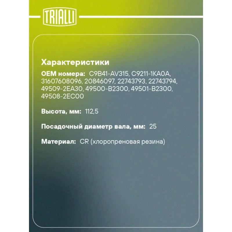 Пыльник ШРУСа наружного для автомобилей Nissan Juke F15 (10-) 1.6i Характеристики: Артикул: FG 1415 OEM номера: C9B41-AV315, C9211-1KA0A, 31607608096, 20846097, 22743793, 22743794, 49509-2EA30, 49500-B2300, 49501-B2300, 49508-2EC00 Сторона установки: со стороны колеса, передняя ось Количество на автомобиль: 2 Высота, мм: 112.5 Гарантийный срок: 1 год/30 000 км Наружный диаметр ШРУСа, мм: 83 Посадочный диаметр вала, мм: 25 Материал: CR (хлоропреновая резина) Товарная линейка: BLACK Подходит для авто: Nissan Juke (10-) Kia Soul I (08-) Для проверки применяемости отправьте VIN автомобиля через вкладку "Есть вопросы о товаре?" Комплектация: Чехол ШРУС - 1 шт Хомут - 2 шт Смазка - 1 шт Гарантия: от 1 года.