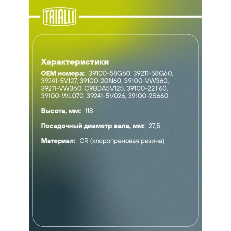 Пыльник ШРУСа наружного для автомобилей Nissan X-Trail T30 (01-) 2.0i/2.5i Характеристики: Артикул: FG 1413 OEM номера: 39100-58G60, 39211-58G60, 39241-5V127, 39100-20N60, 39100-VW360, 39211-VW360, C9BDA5V125, 39100-22T60, 39100-WL070, 39241-5V026, 39100-2S660, 39211-31G60, 39241-5V125, 31607565316, 1K0498203C, 1K0407285P, 1K0498099G Сторона установки: со стороны колеса, передняя ось Количество на автомобиль: 2 Высота, мм: 118 Гарантийный срок: 1 год/30 000 км Наружный диаметр ШРУСа, мм: 96 Посадочный диаметр вала, мм: 27,5 Материал: CR (хлоропреновая резина) Товарная линейка: BLACK Подходит для авто: Nissan X-Trail T30 (01-), Maxima A32 (94-), Cefiro A33 (99-), X-Trail T30 (01-), Pathfinder R50 (95-) Volkswagen Tiguan (08-) Для проверки применяемости отправьте VIN автомобиля через вкладку "Есть вопросы о товаре?" Комплектация: Чехол ШРУС - 1 шт Хомут - 2 шт Смазка - 1 шт Гарантия: от 1 года.