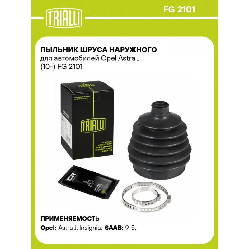 Пыльник ШРУСа наружного для автомобилей Opel Astra J (10-) Характеристики: Артикул: FG 2101 OEM номера: 0374916, 0374917, 0374365, 0374415, 1604008, 0374646, 13291734, 22833444, 13296183, 88957226, 13354380, 13250832, 13354381, C9241AV31J, 39241-AV325, 391019887R, 397937474R, 391009309R, 04438-05210 Сторона установки: со стороны колеса, передняя ось Количество на автомобиль: 2 Высота, мм: 126 Гарантийный срок: 1 год/30 000 км Наружный диаметр ШРУСа, мм: 80 Посадочный диаметр вала, мм: 23.5 Материал: CR (хлоропреновая резина) Товарная линейка: BLACK Подходит для авто: Opel Astra J (10-), Insignia (08-), Astra J (10-), Insignia (08-) SAAB 9-5 (10-) Для проверки применяемости отправьте VIN автомобиля через вкладку "Есть вопросы о товаре?" Комплектация: Чехол ШРУСа - 1 шт Хомут - 2 шт Смазка - 1 туба Гарантия: от 1 года.