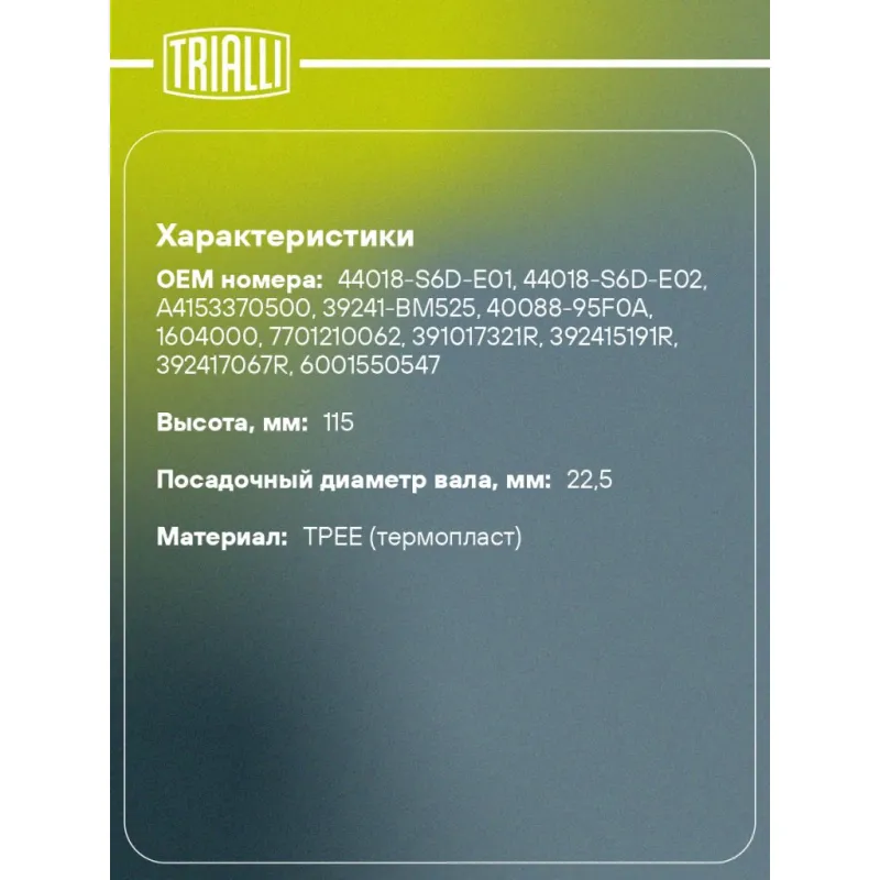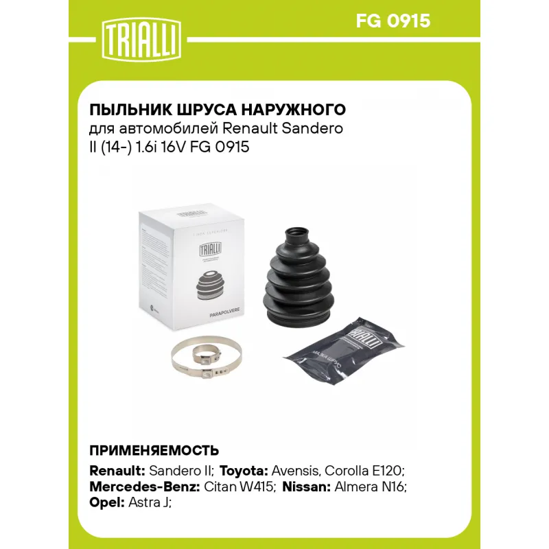 Пыльник ШРУСа наружного для автомобилей Renault Sandero II (14-) 1.6i 16V Характеристики: Артикул: FG 0915 OEM номера: 44018-S6D-E01, 44018-S6D-E02, A4153370500, 39241-BM525, 40088-95F0A, 1604000, 7701210062, 391017321R, 392415191R, 392417067R, 6001550547, 391007525R, LR003161, 13291733, 4153370500 Сторона установки: со стороны колеса, передняя ось Количество на автомобиль: 2 Высота, мм: 115 Гарантийный срок: 1 год/30 000 км Наружный диаметр ШРУСа, мм: 77 Посадочный диаметр вала, мм: 22,5 Материал: TPEE (термопласт) Товарная линейка: BLACK Подходит для авто: Renault Sandero II (14-) Toyota Avensis (97-), Corolla E120 (01-) Mercedes-Benz Citan W415 (12-) Nissan Almera N16 (00-) Opel Astra J (10-) Для проверки применяемости отправьте VIN автомобиля через вкладку "Есть вопросы о товаре?" Комплектация: Чехол ШРУСа - 1 шт Хомут - 2 шт Смазка - 1 шт Гарантия: от 1 года.
